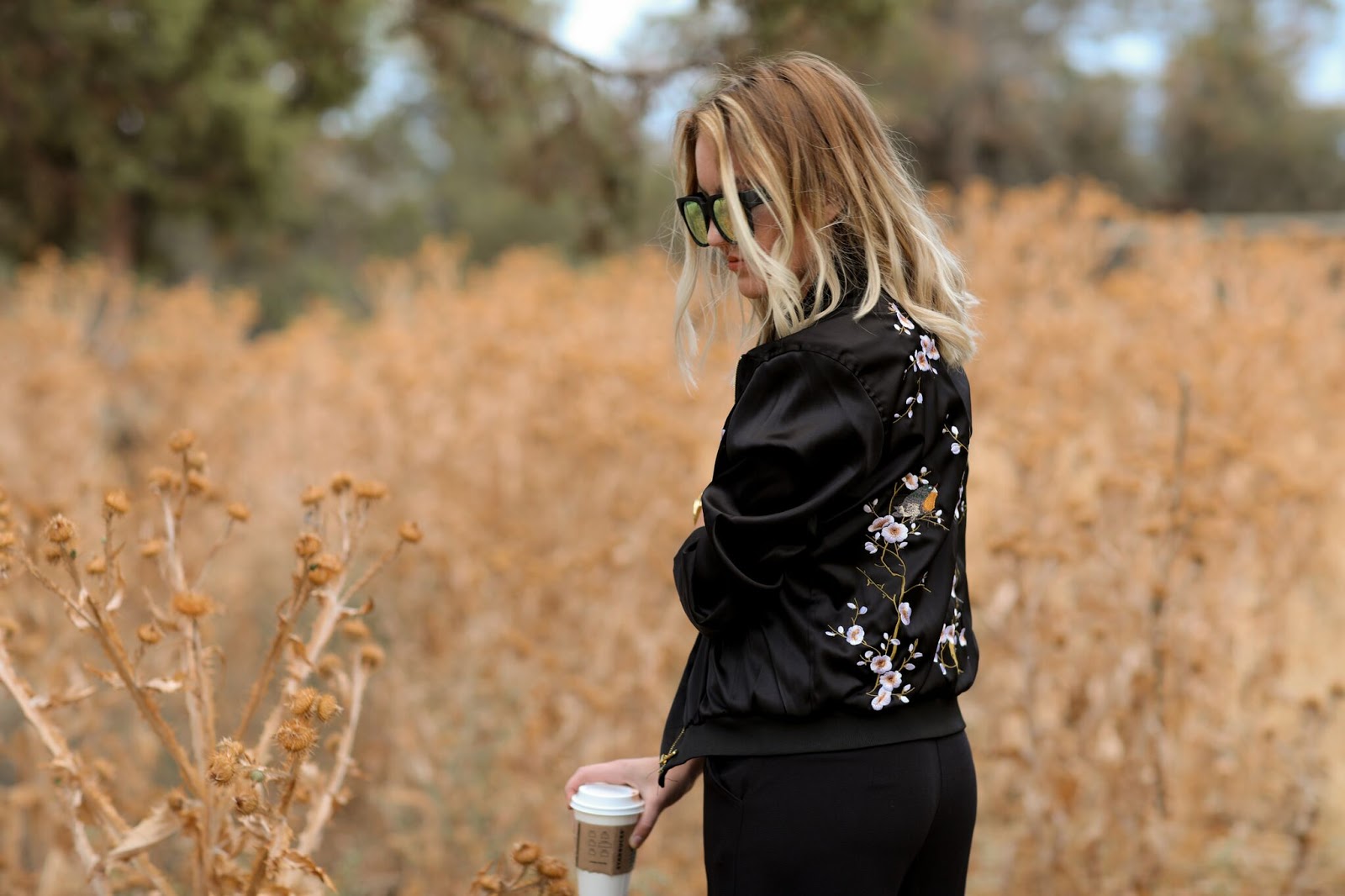 I might have mentioned a few months ago, or even last year that I'm not a fan of overalls. Apparently I just needed to find the right pair because these all black, culotte overalls are at the top of my current list. Even though they're overalls, because of the fabric and color they're relatively simple. To add a little pop I paired them with this amazing embroidered bomber jacket. The little birds on the front of the jacket have some gold, so to give a little more oomph I added a large gold watch.